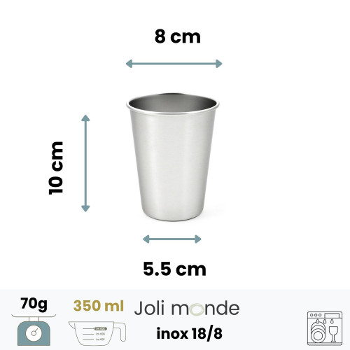 Verre inox 180 ml SILVER - JOLI MONDE Ne plus craindre la toxicité du plastique, ni la fragilité du verre... Léger, stable et facile à tenir par les petites mainsInox 18/8 simple paroi.Hauteur 8 cm . Diamètres 7 cm / 5.3 cm . Contenance 180 ml. Poids 48 g