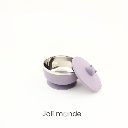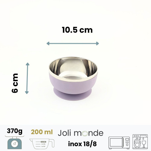 Bol inox à ventouse & couvercle silicone.Inox 18/8.Couvercle silicone souple étanche.Diamètre 10.5 cm . Hauteur 6 cm . Contenance 200ml . Poids 370 g. Ventouse non amovible.A partir de 4 mois.