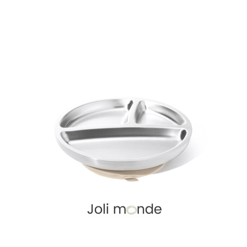 Assiette inox 3 compartiments et sa ventouse de fixationInox 18/8 double paroi isolé.Ventouse en silicone de qualité alimentaire, amovible pour une nettoyage approfondi.Diamètre 19 cm . Hauteur des bords 3 cm . Hauteur totale 5 cm . Contenance 350 ml . Poids 370 g