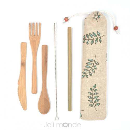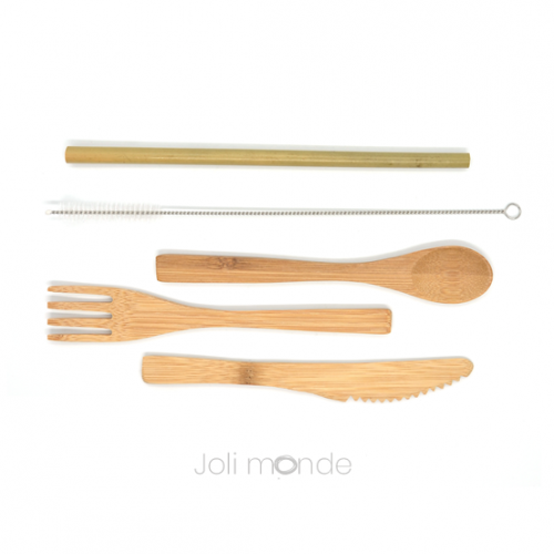 Contient 5 pièces : cuillère, couteau et fourchette pour manger un repas complet ; une paille & son goupillon d'entretien pour siroter en toute simplicité boissons chaudes & froides.
